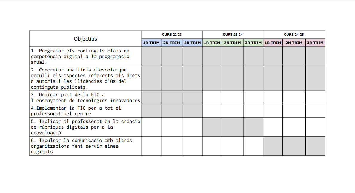 A partir d’aquestes dades i la diagnosi, s’han establert diferents objectiu, indicadors i s’han temporitzat per assolir-los en tres cursos.