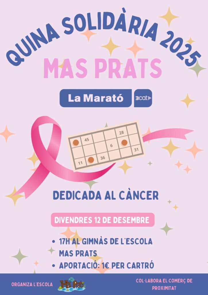 Arriba la nostra Quina Solidària de la Marató! Prepareu l’agenda perquè… torna una de les tardes més especials de l’any!El divendres *12 de desembre*, a les 17 h, us esperem a l’escola per gaudir d’una Quina Solidària plena d’emoció, diversió i molta, molta il·lusió. Enguany, la Marató se centra en la lluita contra el càncer, […]