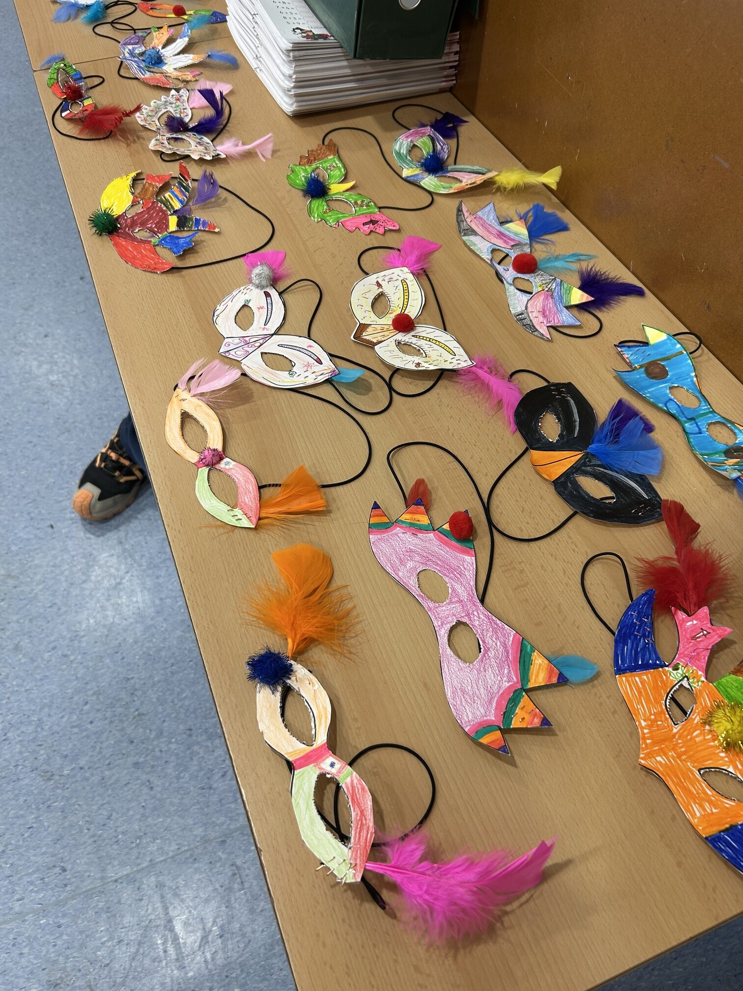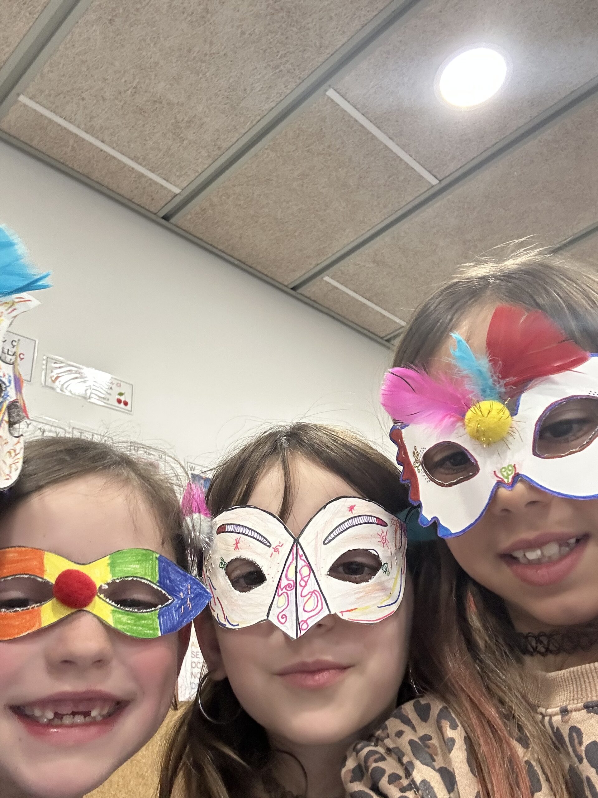 Durant els dies previs, totes les classes van estar preparant màscares i complements ben originals per donar-li la benvinguda com cal. L’escola feia goig: plomes, purpurina, cartolines de colors i molta creativitat van convertir els passadissos en un autèntic taller de Carnaval.