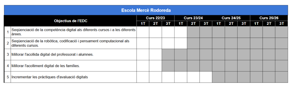 Després de realitzar la diagnosi, concretem els objectius de l’Estratègia Digital de Centre, tot determinant la visió del centre en l’àmbit digital i tenir en compte els objectius del PEC i del projecte de direcció, sense perdre de vista els objectius del PEDC.