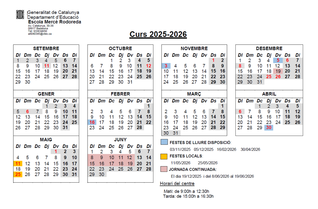El dia 19 de desembre de 2025 i a partir del 8 de juny de 2026 es realitza horari intensiu de 9 a 13h.