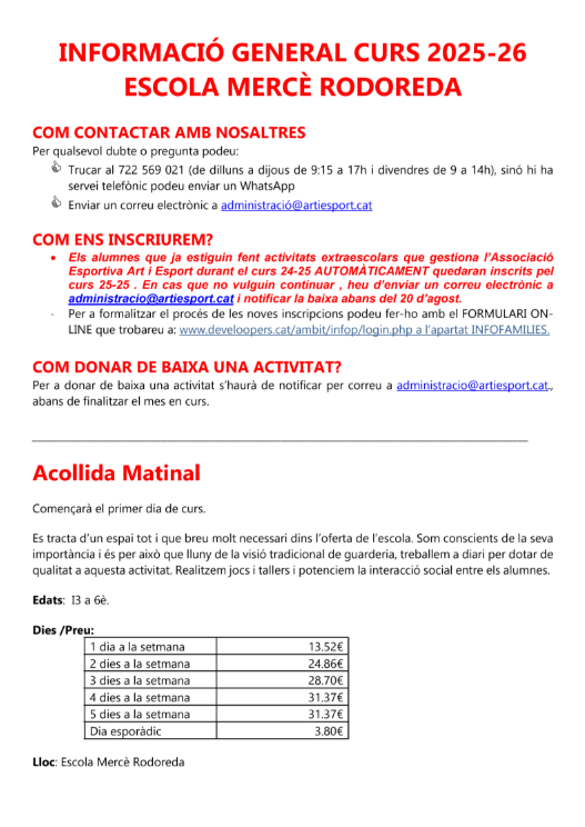 Acollida El servei d’acollida matinal el porta l’empresa Art i esport. La Montse és la monitora que el gestiona. Podeu trobat tota la informació clicant a l’enllaç.