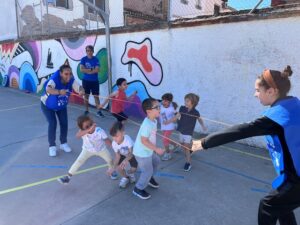 A la hora del patio hemos hecho unos cuantos juegos con ellos , hemos hecho: tiro con arco, tirar de la cuerda, la goma y “tella”.