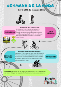 13/05/24Al llarg d’aquesta setmana, a l’escola durem a terme la “Setmana de la Roda” per la qual cosa s’han planificat diferents activitats: