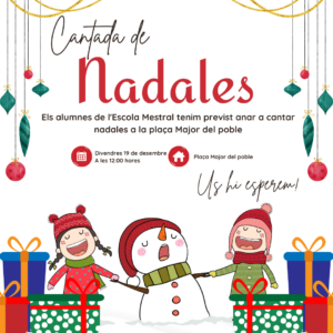 Us informem que els alumnes de l’Escola Mestral tenim previst anar a cantar nadales a la plaça Major del poble, el proper divendres 19 de desembre, a les 12h.