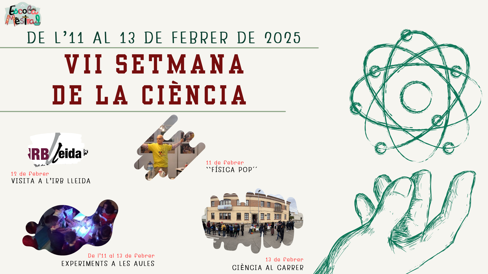 Ens fa molta il·lusió poder compartir, el dijous 13 de febrer, un recull dels diferents experiments treballats durant la VII Setmana de la Ciència. Per la qual cosa, a partir de les 15:45 hores durem a terme una petita mostra, oberta a les famílies. Aquesta es realitzarà al carrer de davant de l’escola. Us hi esperem!