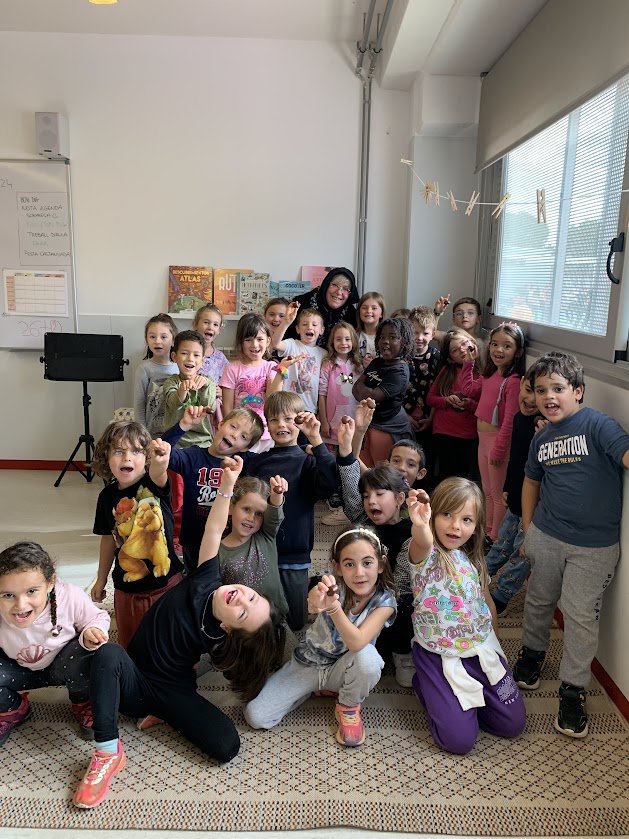 Aquí estem ben guapos i guapes amb la Castanyera, que ens va venir a visitar a la classe per explicar-nos la feinada que té quan s’acosta aquesta gran festa! Nosaltres li vam fer uns dibuixos molt originals i li vam ballar una dansa. A la tarda vam poder menjar castanyes amb tots els nens i nenes de l’escola!