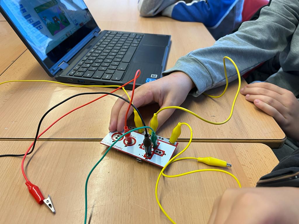Llavors, connectant-ho amb les plaques Makey-Makey i uns altaveus, vam crear música picant de mans. Després d’assajar una mica per taules, vam fer música tots plegats.