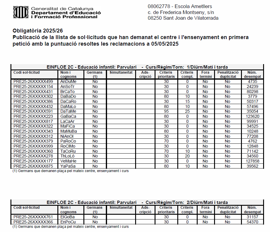 Publicació de la llista de sol·licituds que han demanat l’escola Ametllers en primera petició amb la puntuació resoltes les reclamacions a 05/05/2025 (cliqueu sobre la imatge) Feu un comentari / Per Albert Viu / 5 de maig de 2025 / Curs 24-25 Portada sn