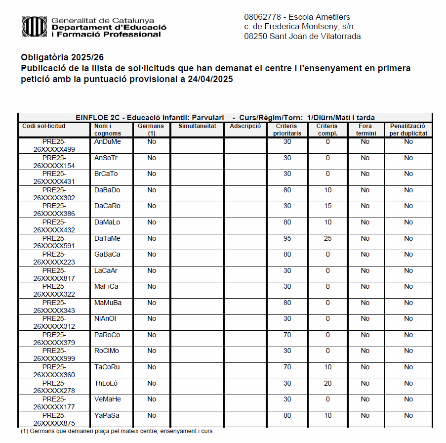 Publicació de la llista de sol·licituds que han demanat l’Escola Ametllers en primera petició (cliqueu la imatge). Feu un comentari / Per Albert Viu / 24 d'abril de 2025 / Curs 24-25 Portada sn