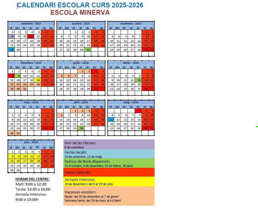 El dia 19 de desembre de 2025 i a partir del 9 de juny de 2025 es realitza horari compactat de 9 a 13h. (Els alumnes que utilitzen el servei de menjador surten a les 15:00h.)