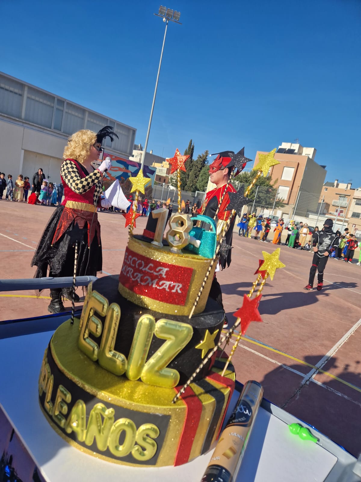 Els alumnes de l’escola hem sortit al pati de l’escola a rebre al Rei Carnestoltes i escoltar les ordres que haurem de complir si no volem que ens pintin la cara. De ben segur que serà una setmana molt divertida on la gresca i la xerinola s’obriran pas.