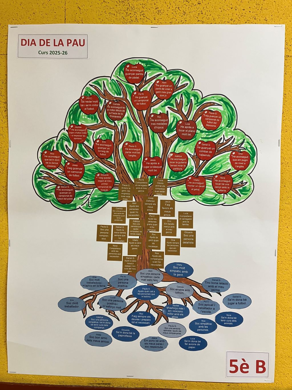 Divendres 30 de gener, vam celebrar el Dia Escolar de la No Violència i la Pau. Vam realitzar diferents activitats i dinàmiques en relació. Entre elles, vam elaborar un arbre on donàvem importància totes les seves parts: arrels, branques, fruits… i treballar que cada grup és un arbre que creix i que tots som importants.
