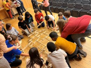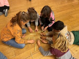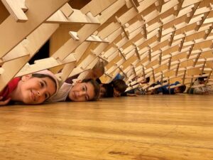 Un cop construïda, l’hem aixecat i hi hem entrat a dins. Ha estat un moment on ens hem hagut de coordinar molt, ja que les fustes se sostenen entre elles i, en cas de fallar-ne una, tot cau encadenadament.