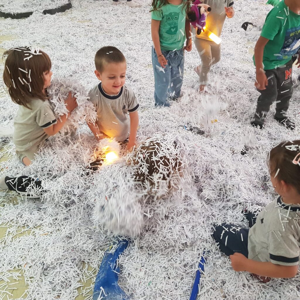 Els infants d’EI3 van gaudir ahir d’una sessió diferent de psicomotricitat. L’aula plena de papers, llumetes i pelutxos, convidava els infants a rodolar pel terra ple de papers, tirar-se’ls pel cap i amagar-se sota una muntanya.