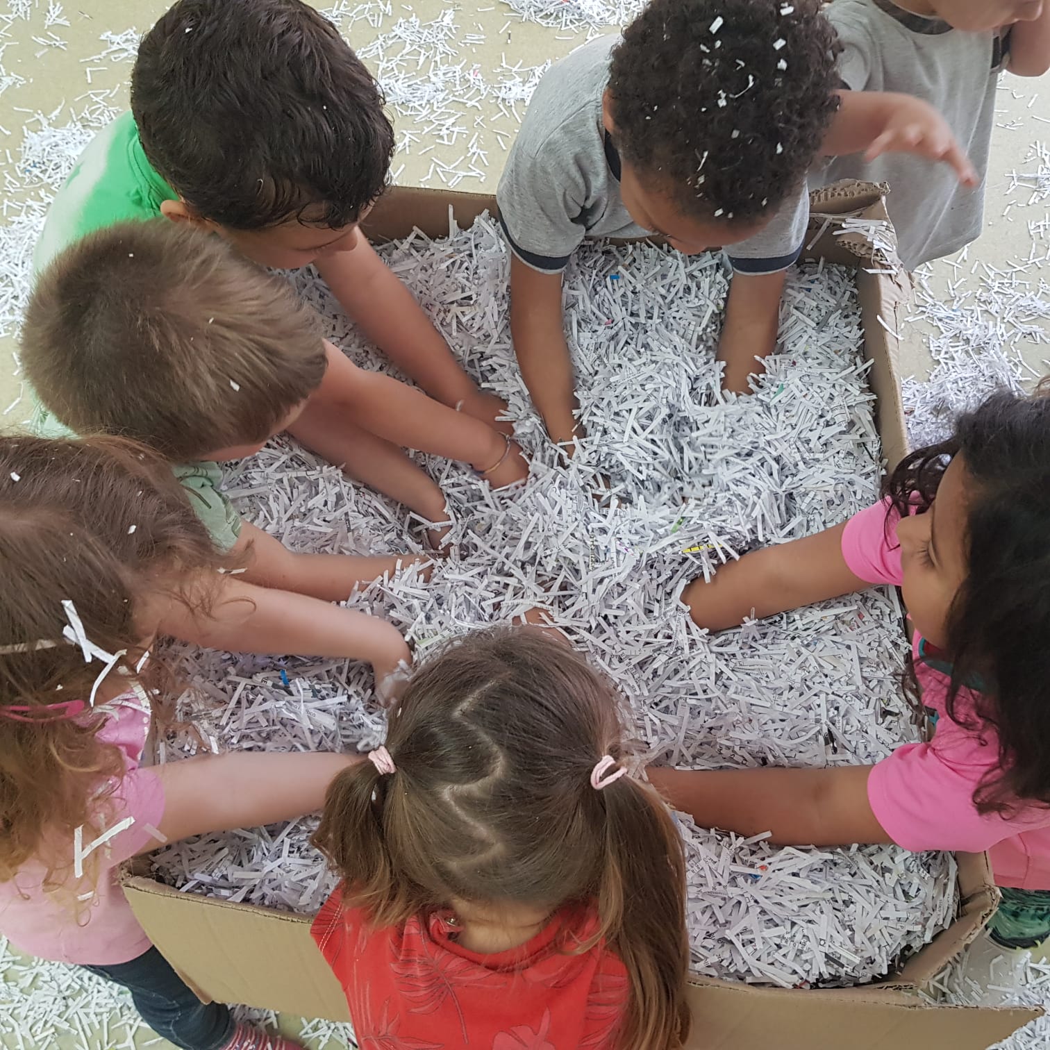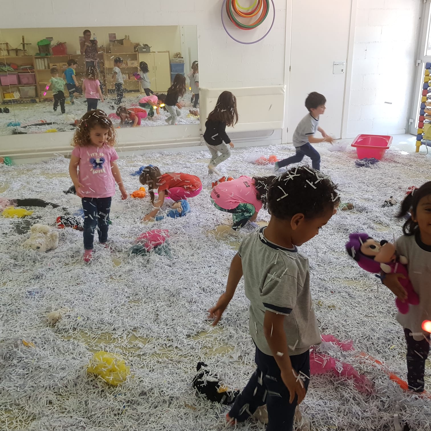 Els infants d’EI3 van gaudir ahir d’una sessió diferent de psicomotricitat. L’aula plena de papers, llumetes i pelutxos, convidava els infants a rodolar pel terra ple de papers, tirar-se’ls pel cap i amagar-se sota una muntanya.