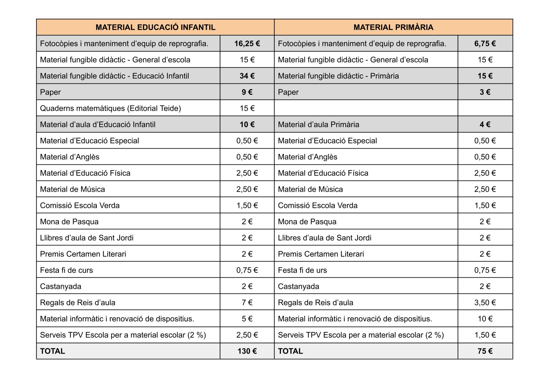 Aportació material famílies, curs 25-26
