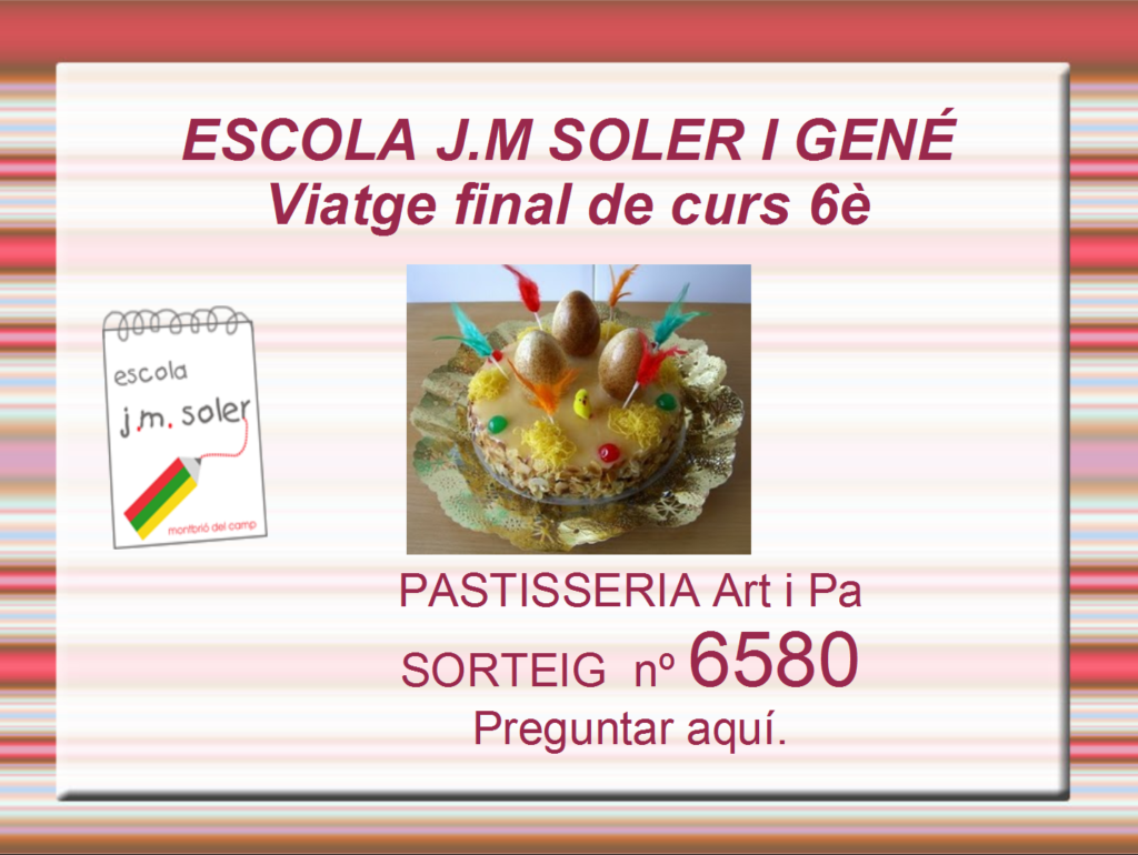 El nens i nenes de 6è de l’escola Josep M. Soler i Gené hem organitzat un sorteig d’una mona de Pasqua per tal d’aconseguir diners pel viatge de final de curs.