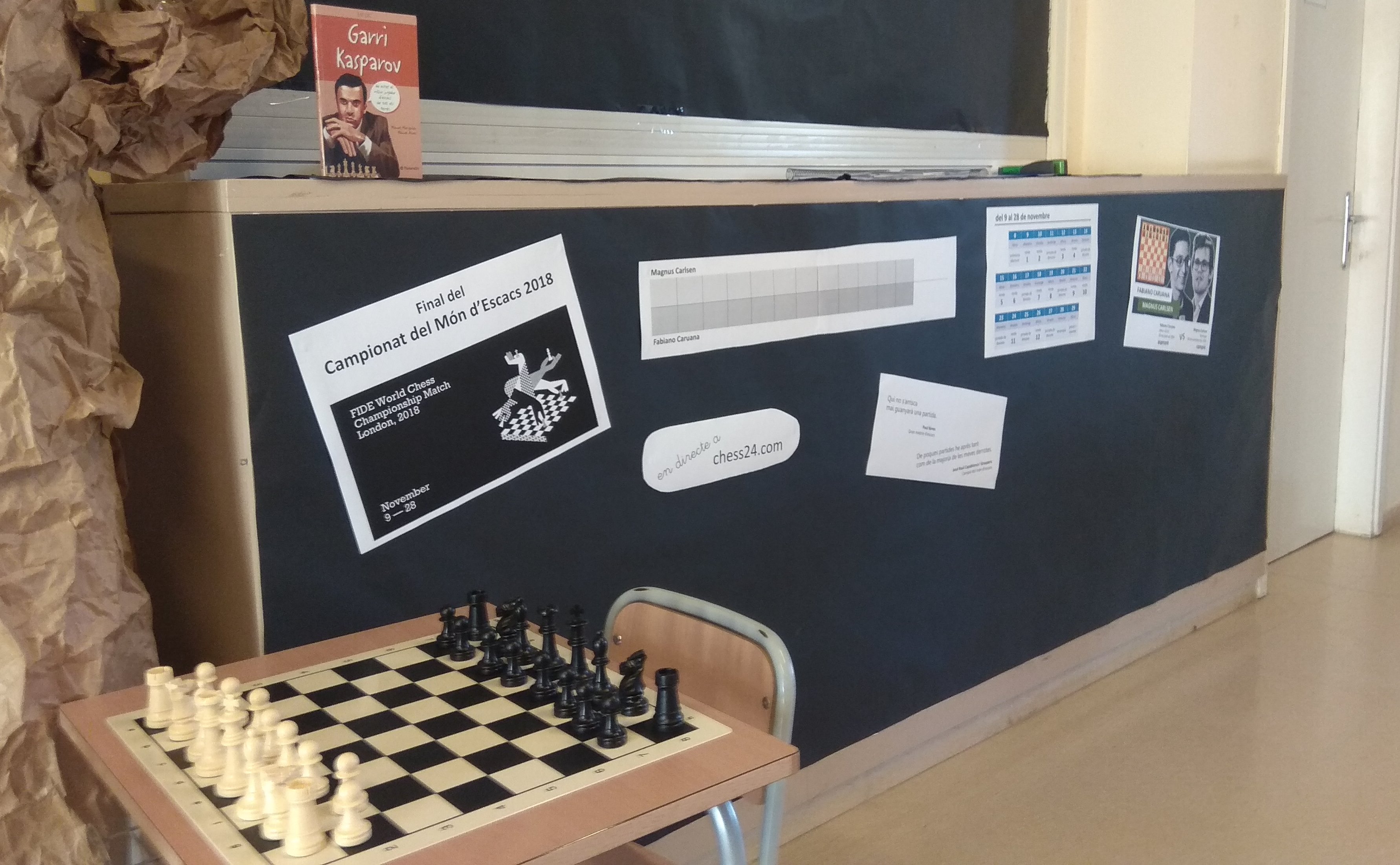 A l’escola hem decidit seguir-ne el desenvolupament. Hem creat una cartellera amb informació del campionat, dels 2 contrincants i un marcador amb els resultats. En algunes classes també observarem i/o analitzarem algunes partides.