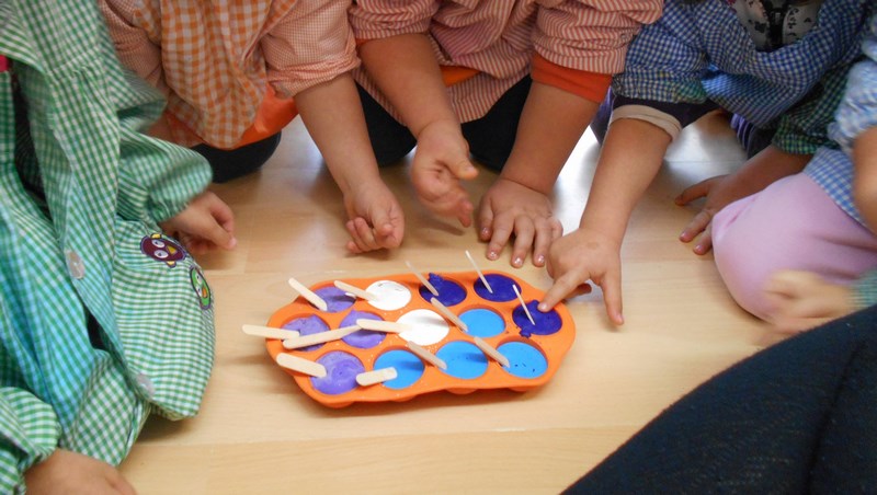 Amb l’arribada de l’hivern hem treballat els colors propis d’aquesta estació de l’any, a partir de diferents creacions plàstiques i de la manipulació d’elements naturals: pintura congelada, murals, cortines per les nostres finestres de l’aula, neu artificial, entre d’altres. També sortíem al pati i observàvem zones on trobàvem gel. Va ser curiós perquè els infants