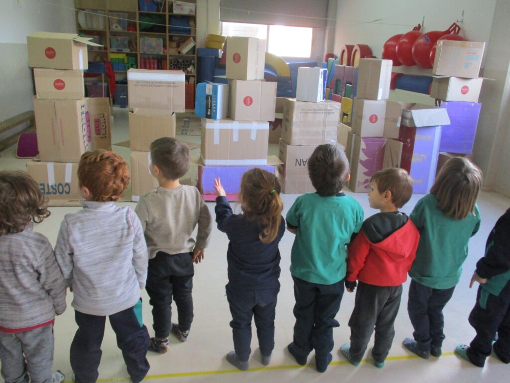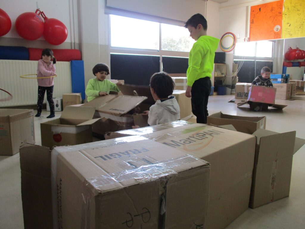 A Psicomotricitat, aquest segon trimestre, la Comunitat de Petits hem gaudit jugant amb capses de cartó. L’aula s’ha convertit en un espai on imaginar, crear, amagar-se, entrar, sortir, omplir, buidar,… en definitiva, transformar.