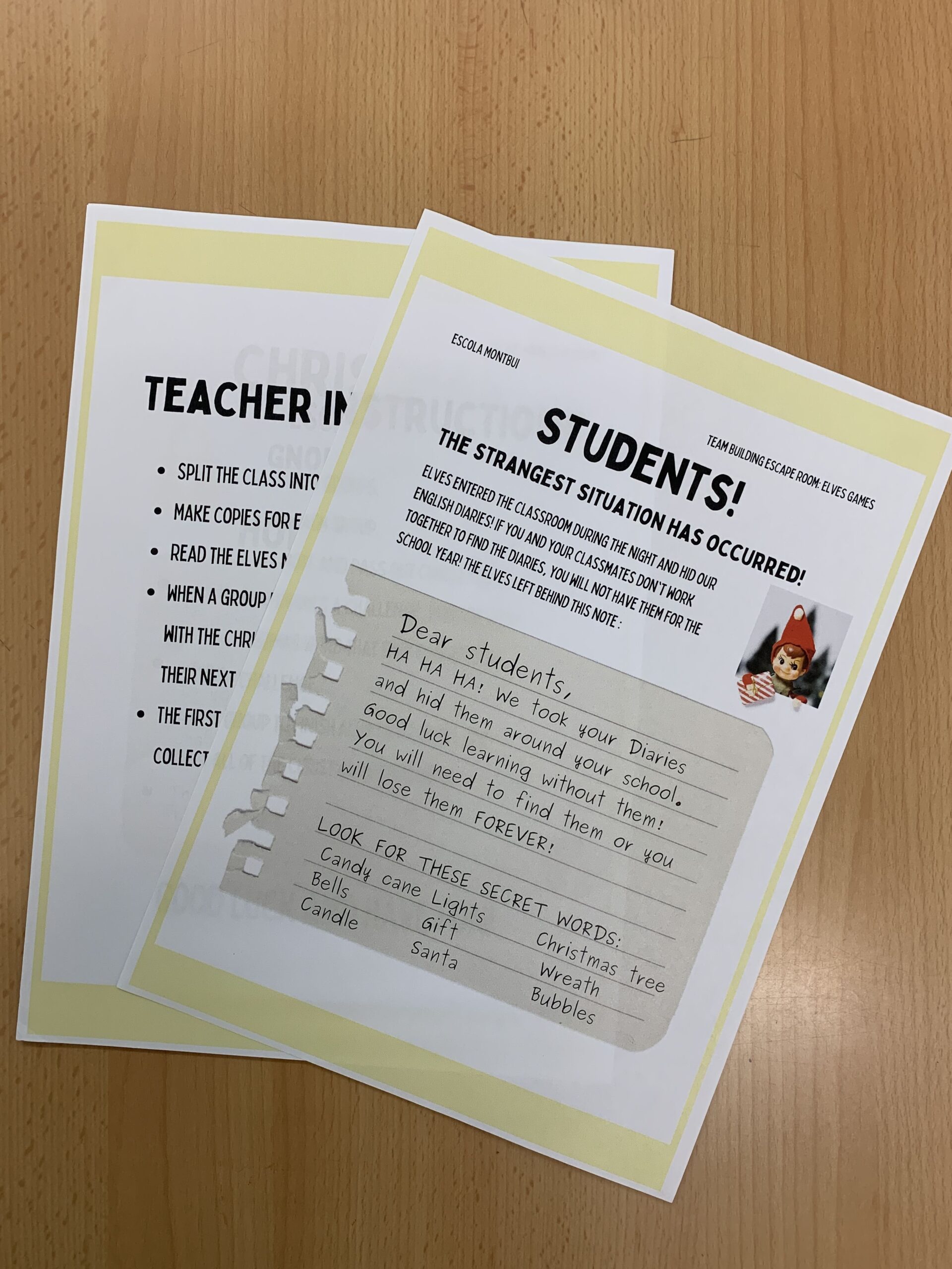 Els elves van entrar a l’escola a l’hora del pati i van robar els Diaries i només superant diferents reptes lingüístics podrien recuperar-los. Organitzats en grups cooperatius, els alumnes han hagut de posar a prova la seva creativitat, enginy i habilitats en anglès per resoldre enigmes, trencaclosques i jocs de vocabulari.