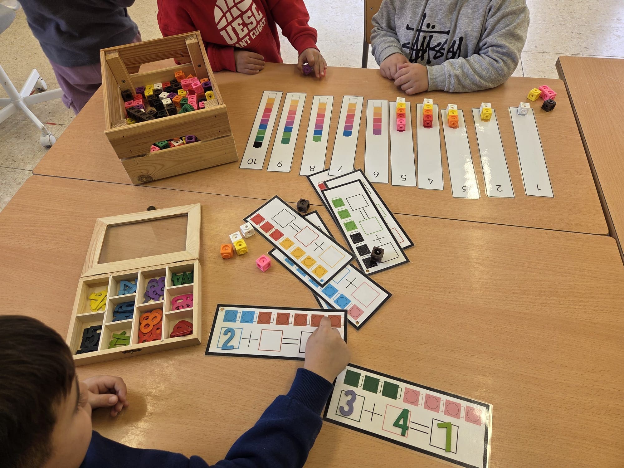 Els ambients que es proposen són: ambient de lletres, ambient matemàtic i científic i ambient d’experimentació / aula dels sentits. A cada espai, els infants troben diferents propostes manipulatives pensades per afavorir l’exploració, la curiositat i l’aprenentatge significatiu.