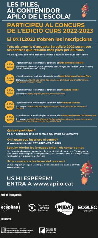 Com a Agents Apilo, teniu la missió de localitzar PILES I BATERIES, portar-les al centre i dipositar al contenidor que tenim a l’entrada de l’Escola i al pati d’Educació Infantil.