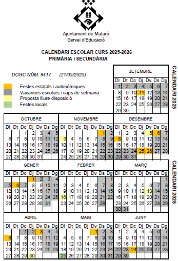 El Consell Escolar Municipal de Mataró, reunit el passat 22 de maig de 2025, va fixar els cinc dies festius de lliure disposició per al curs 2025-2026, i són: