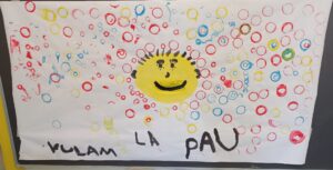 Hem explicat el conte: “Volem la Pau”, un conte adaptat per “Una mà de contes” i originalment elaborat per alumnes de l’escola Pau Sans de l’Hospitalet. En acabat, hem traspassat la història a una proposta de mural sobre paper amb la tècnica d’estampació. Cada cercle de color representa una manera de fer la Pau. Amb el mural acabat, la boca del rei groc ha pogut convertir-se en un bell somriure.