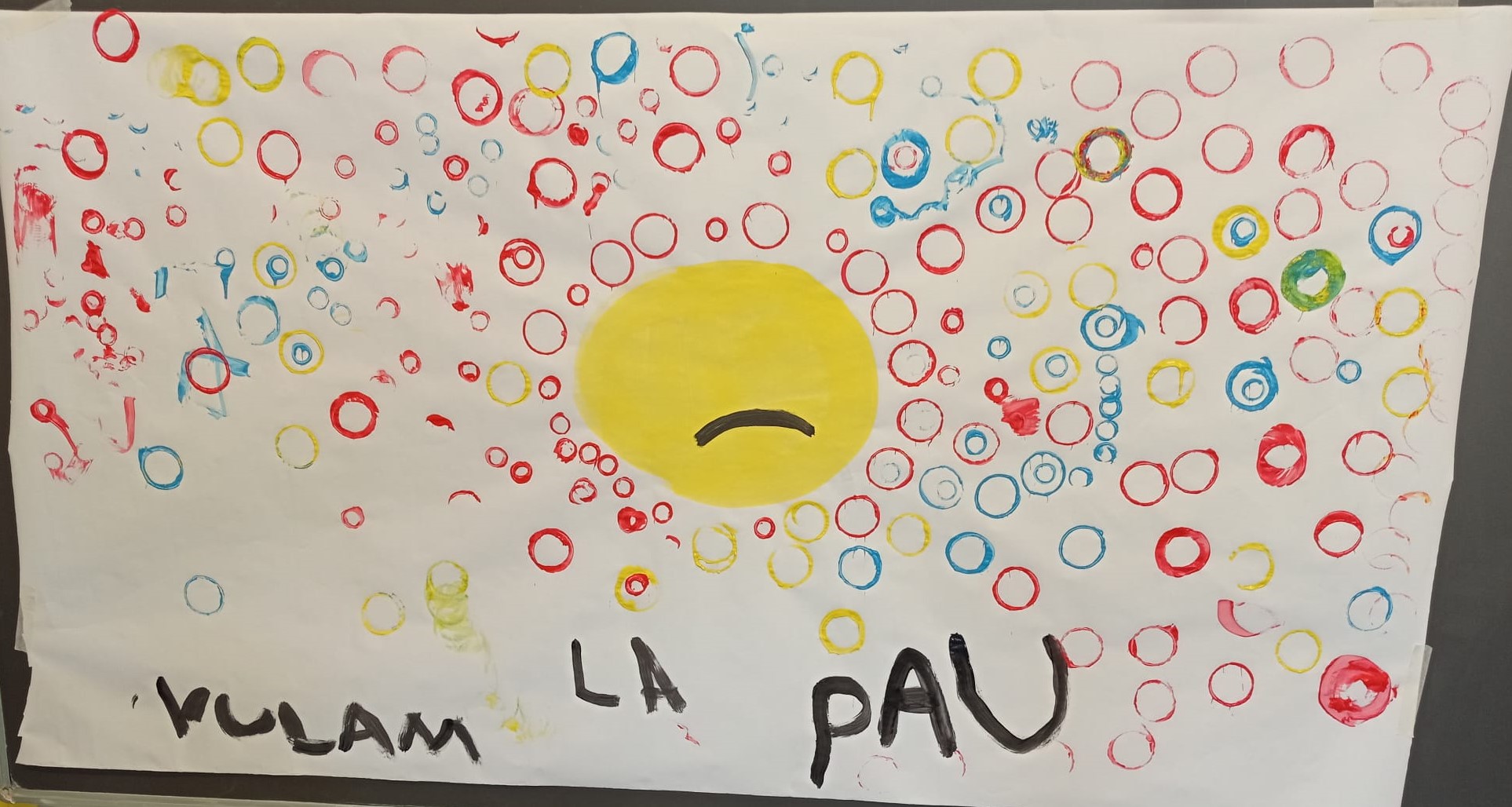 Hem explicat el conte: “Volem la Pau”, un conte adaptat per “Una mà de contes” i originalment elaborat per alumnes de l’escola Pau Sans de l’Hospitalet. En acabat, hem traspassat la història a una proposta de mural sobre paper amb la tècnica d’estampació. Cada cercle de color representa una manera de fer la Pau. Amb el mural acabat, la boca del rei groc ha pogut convertir-se en un bell somriure.