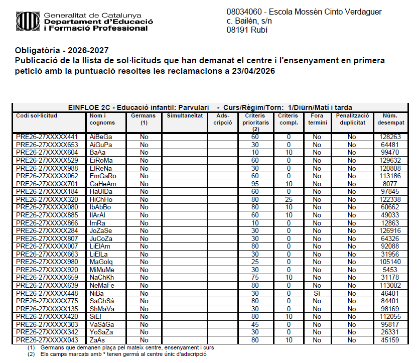 Llistat sol.licituds després de reclamacionsPer Escola MnCinto / 25 d'abril de 2026 / General Portada / #curs26/27, Preinscripció, resolució 20260423 LLISTA_BAREM_RESOLTES_RECLAMACIONS