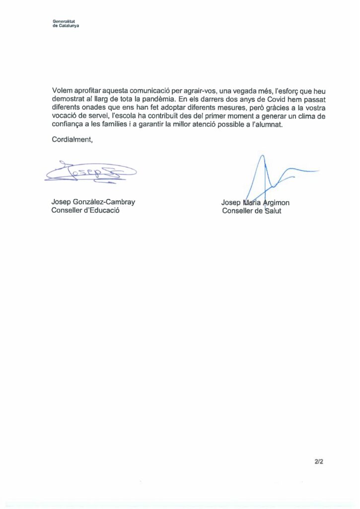 Carta dels Departaments d’Educació i Salut sobre la fi del seguiment del Covid19Per Escola MnCinto / 21 de febrer de 2022 / Portada / carta fi seguiment covid19