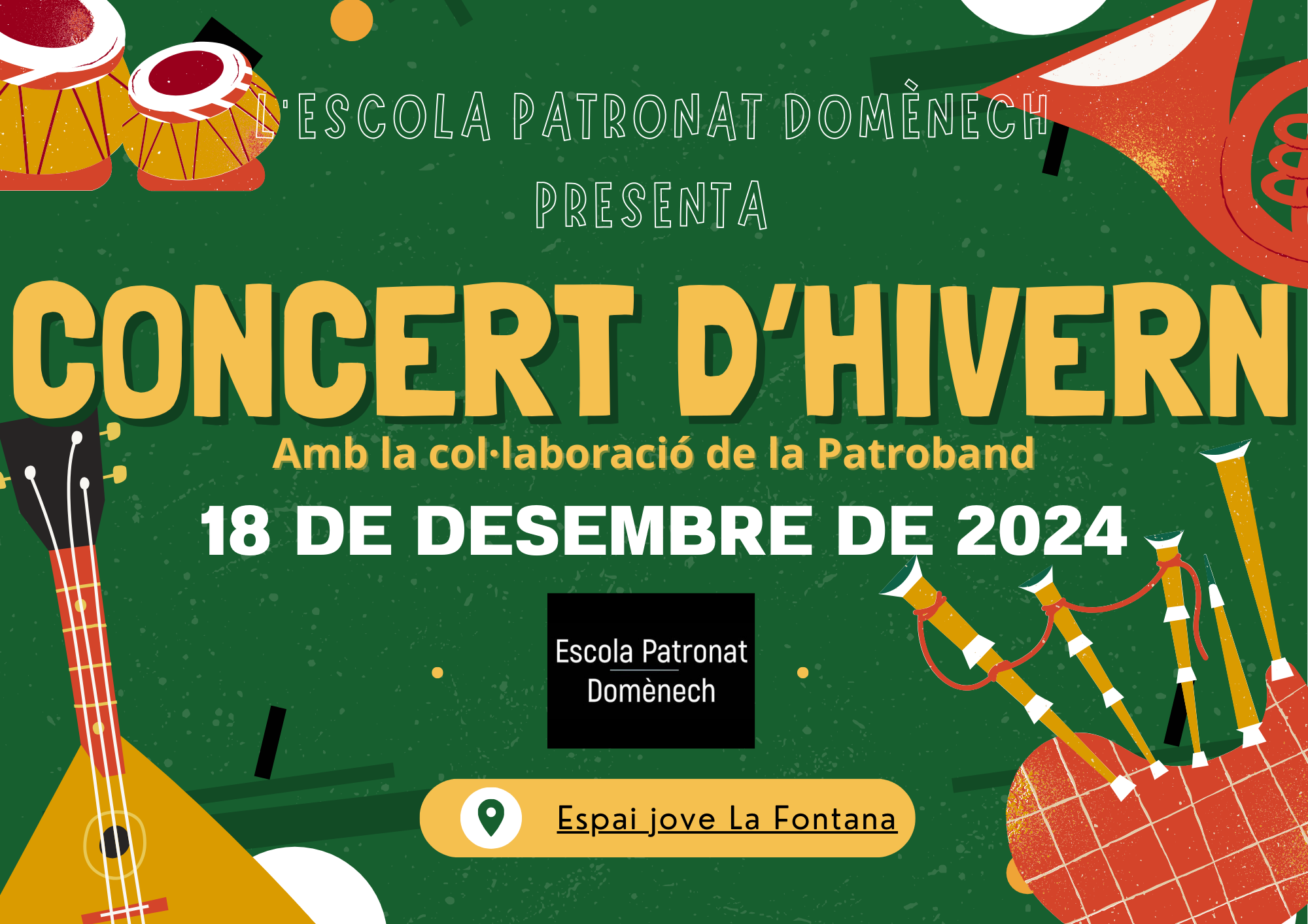 El dimecres 18, a la tarda, farem el CONCERT D’HIVERN a l’Espai Jove la Fontana; començarà a les 15.15 h i les portes s’obriran a partir de les 15 h.