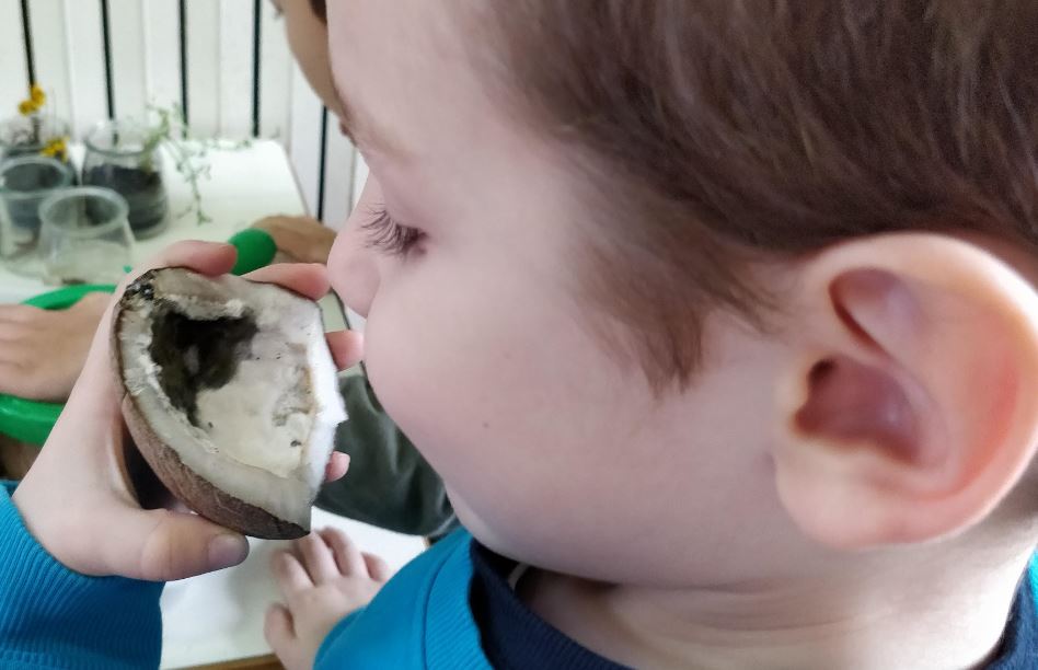 Al nou espai de P4, el pas del temps, vam poder olorar diferents essències que ens han portat a parlar sobre quines podien ser les seves procedències. Jugant amb les diferents olors, una d’elles ens va cridar especialment l’atenció, el coco. Quan vam preguntar que era el coco? de seguida, molts dels nens/es van contestar que