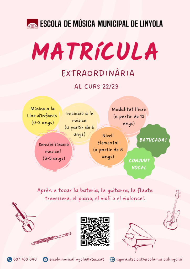 A partir del 29 d’agost queda obert el període extraordinari de matrícula. Podeu fer-la omplint el següent formulari i enviant-lo a escolamusicalinyola@xtec.cat o bé entregant-lo en persona a l’escola de música o a l’ajuntament de Linyola.