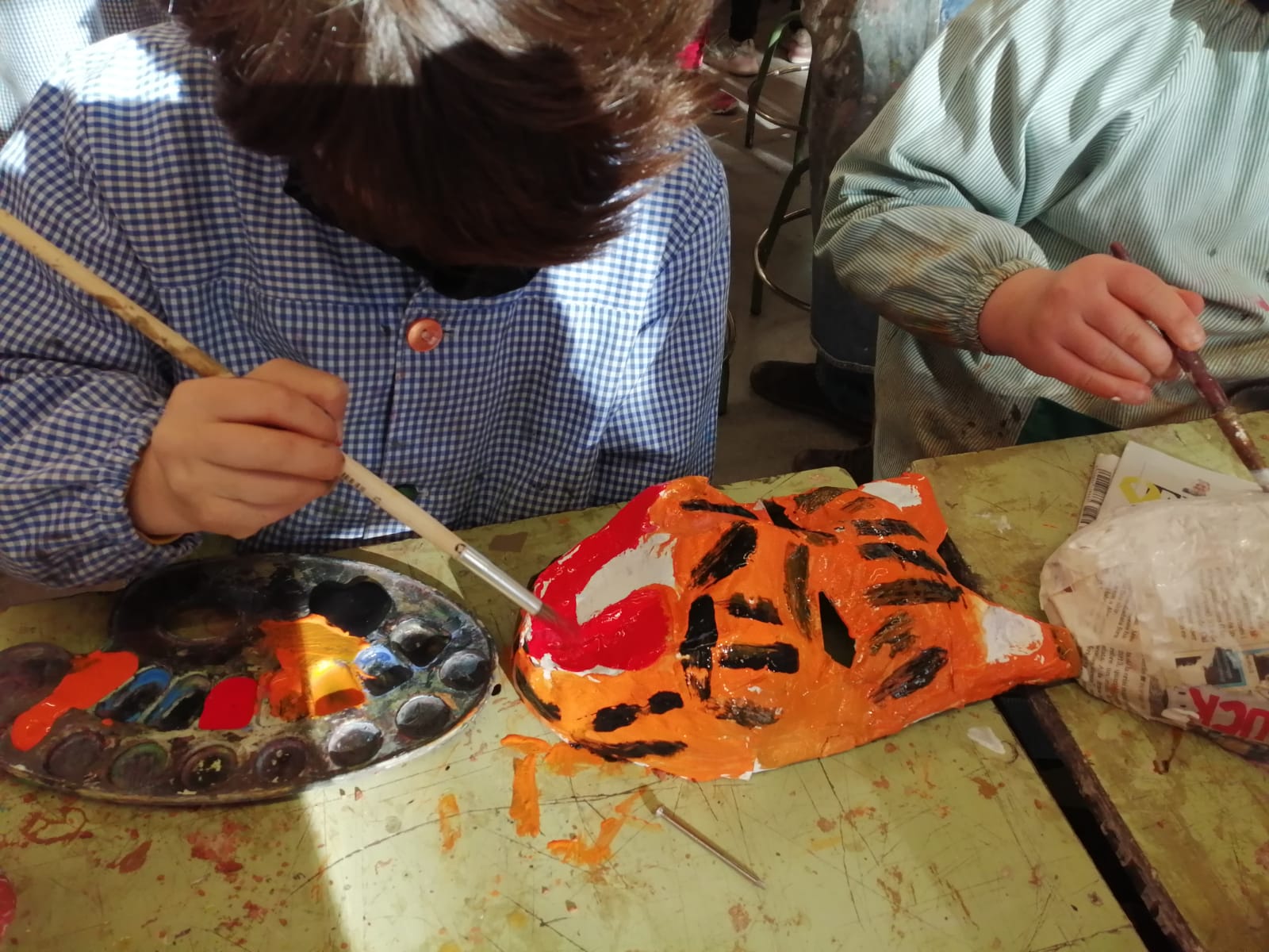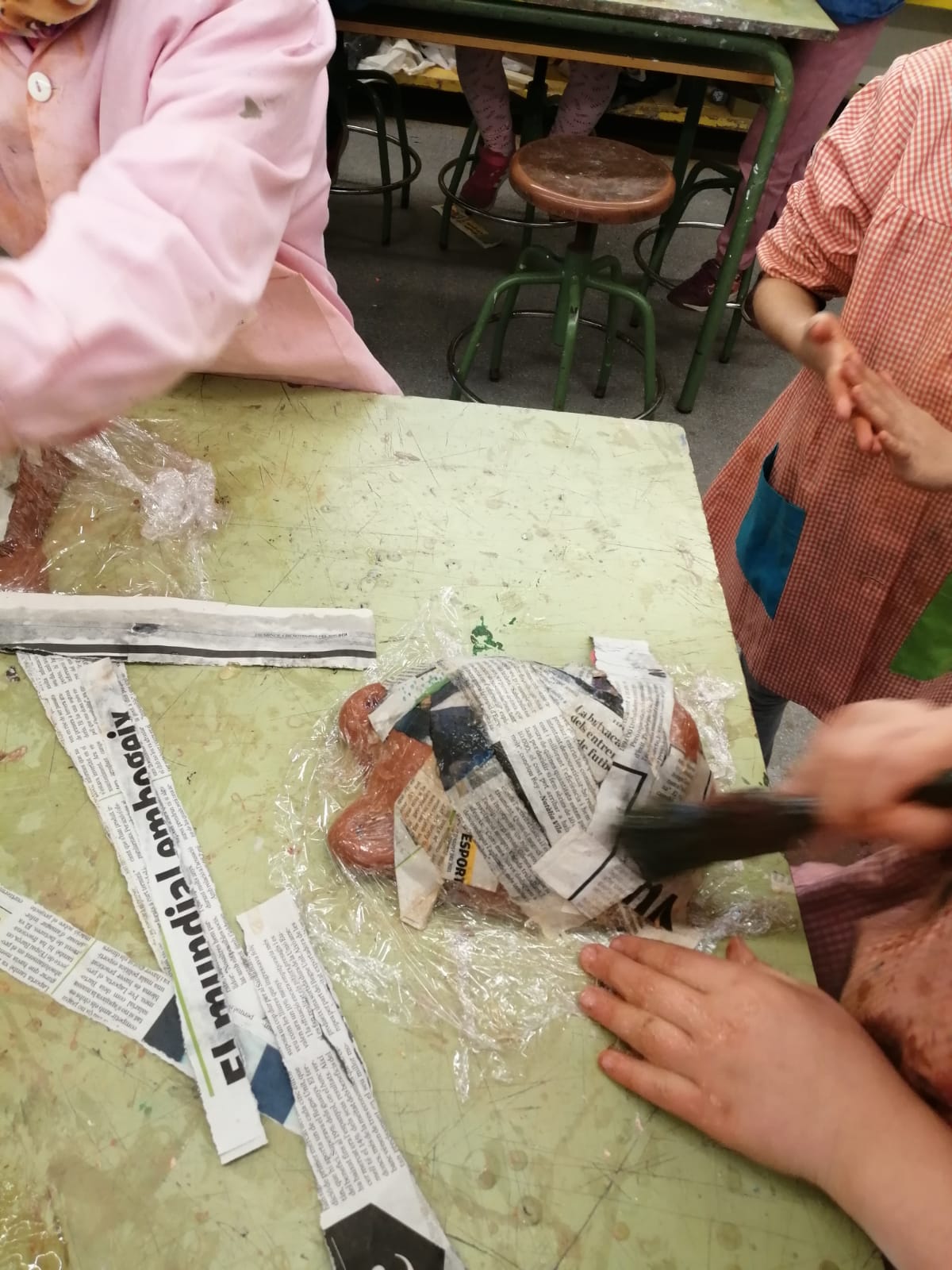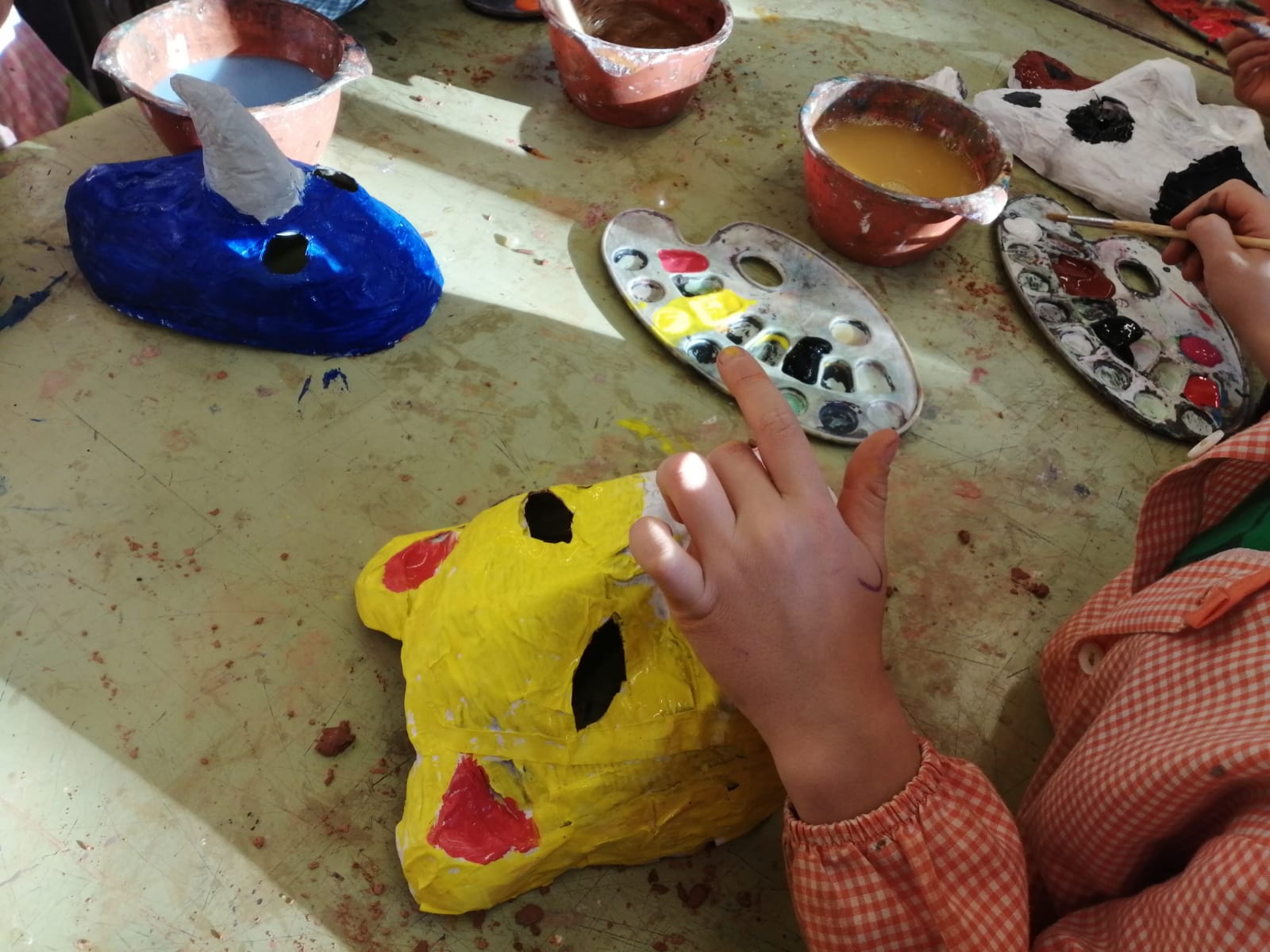 Ens estem fent les màscares de carnaval. Nosaltres hem escollit el tema dels animals. Primer hem dibuixat l’animal que volem ser. Després ens hem mesurat la cara i hem fet el motlle amb fang. Un cop acabat, l’hem cobert amb film transparent i hem posat moltes capes de paper de diari amb cola. Quan s’ha assecat les hem pintat. Ens estan quedant molt boniques!