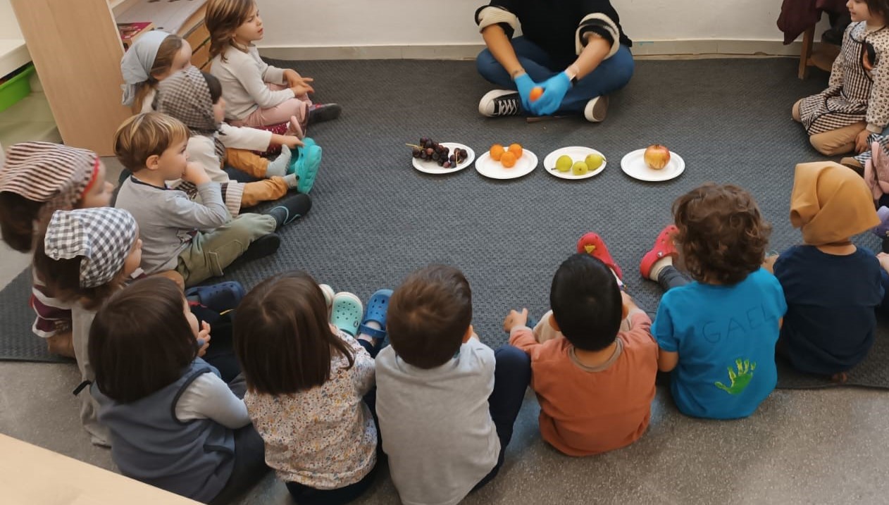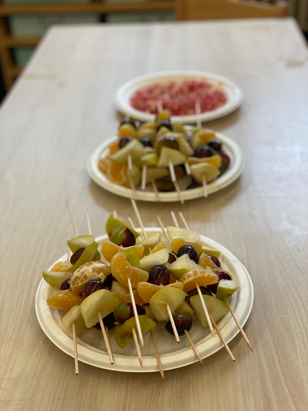 Les nenes i nens d’I3 hem celebrat la castanyada preparant unes broquetes de fruita. Les hem preparat amb fruites de la tardor; raïm, pera i mandarina.
