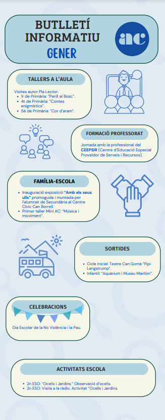 Butlletí informatiu – Gener 2025Per Escola Nou Clavé / 13 de febrer de 2025 / General / #ButlletíInformatiu, Escola Activa, Escola Anselm Clavé, Som Anselm Clavé Benvolgudes famílies, Ja teniu disponible el butlletí informatiu del mes de gener. Esperem que sigui del vostre interès!
