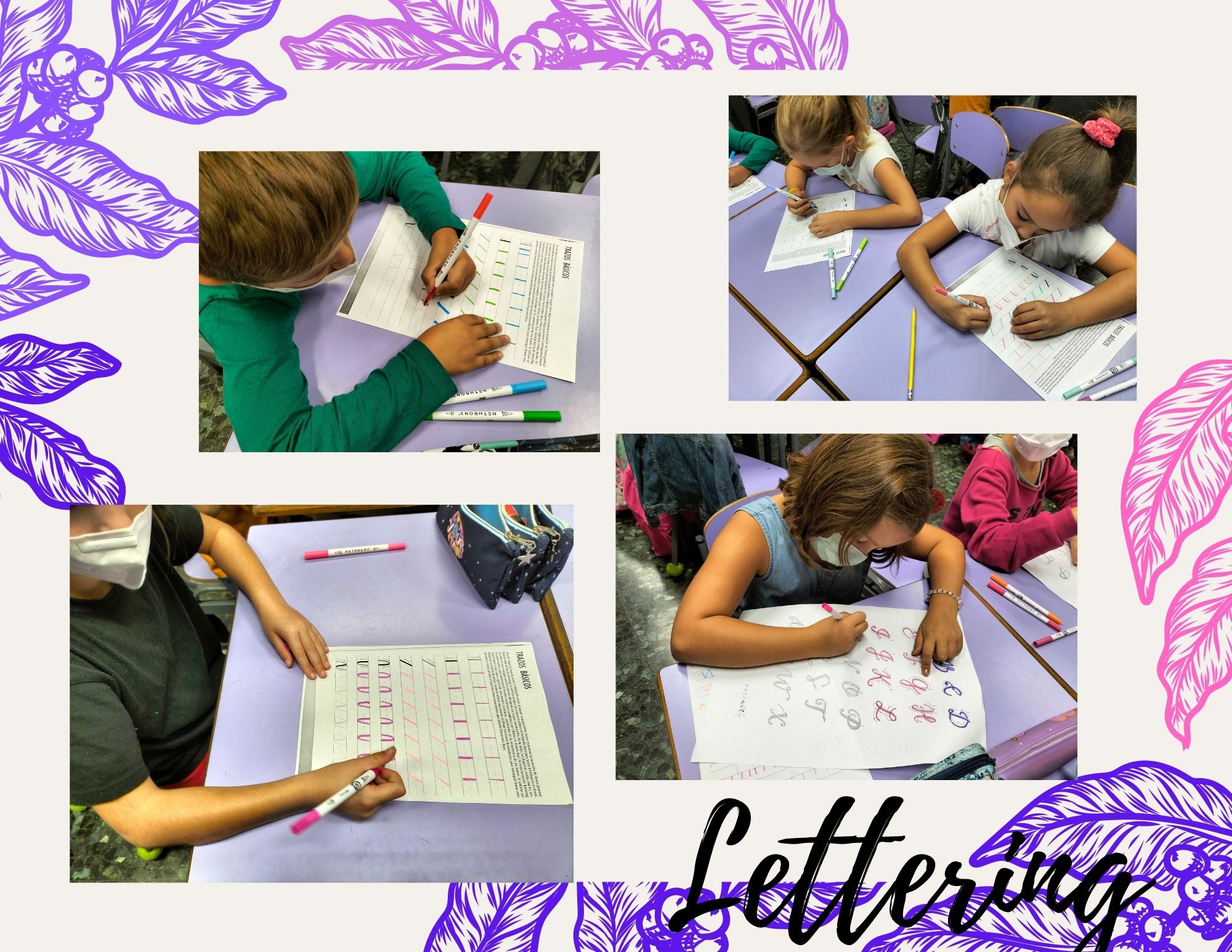 També en aquest espai practiquem el lettering. El lettering és l’art de dibuixar lletres a mà de forma artística i creativa. Hem començat realitzant el Brush lettering, utilitzant retoladors amb punta de pinzell. Aquest estil es basa en la realització d’un traç lligat aplicant diferents pressions aconseguint així una línia més gruixuda o fina. Aquesta activitat està agradant molt a tots els nens i nenes i es mostren motivats a seguir practicant per anar perfeccionant les diferents tècniques.
