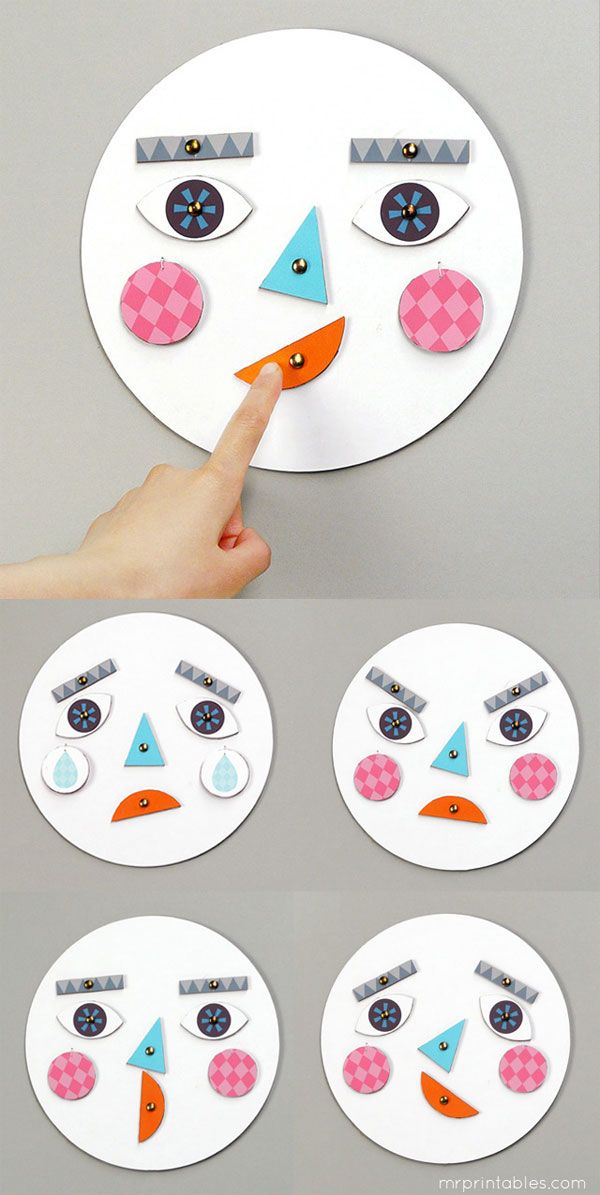Ja veieu, és molt senzill. Només necessiteu una mica de cartró i colors. A la imatge, també fan servir enquadernadors per enganxar cada una de les parts de la cara al cartró, però si no en teniu, podeu fer les celles, els ulls, el nas, la boca i les galtes sense enganxar-ho així us serà més senzill anar canviant les diferents expressions. Podreu fer servir aquesta cara per explicar com us sentiu cada dia. Vinga, nois, a treballar!!