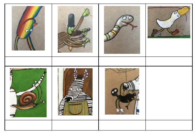 Acabem fent un repàs del personatges que sortien en el conte. Intenta ordenar-los seguint la seva aparició. Escriu el número corresponent al seu ordre a sota de la imatge o bé assenyala amb el dit marcant l’ordre d’aparició.