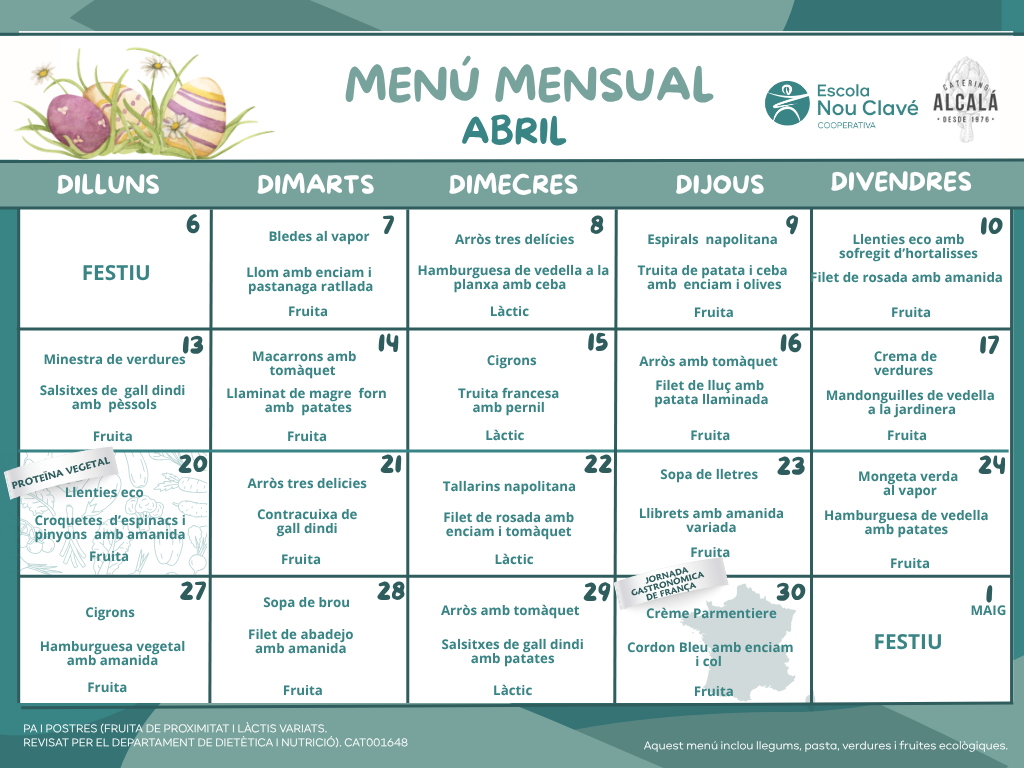El servei de càtering va a càrrec de Catering Alcalá, una empresa que comparteix la nostra mirada: oferir menús equilibrats, saborosos i sostenibles, elaborats amb ingredients de qualitat i pensats per satisfer les necessitats nutricionals dels infants en etapa escolar.