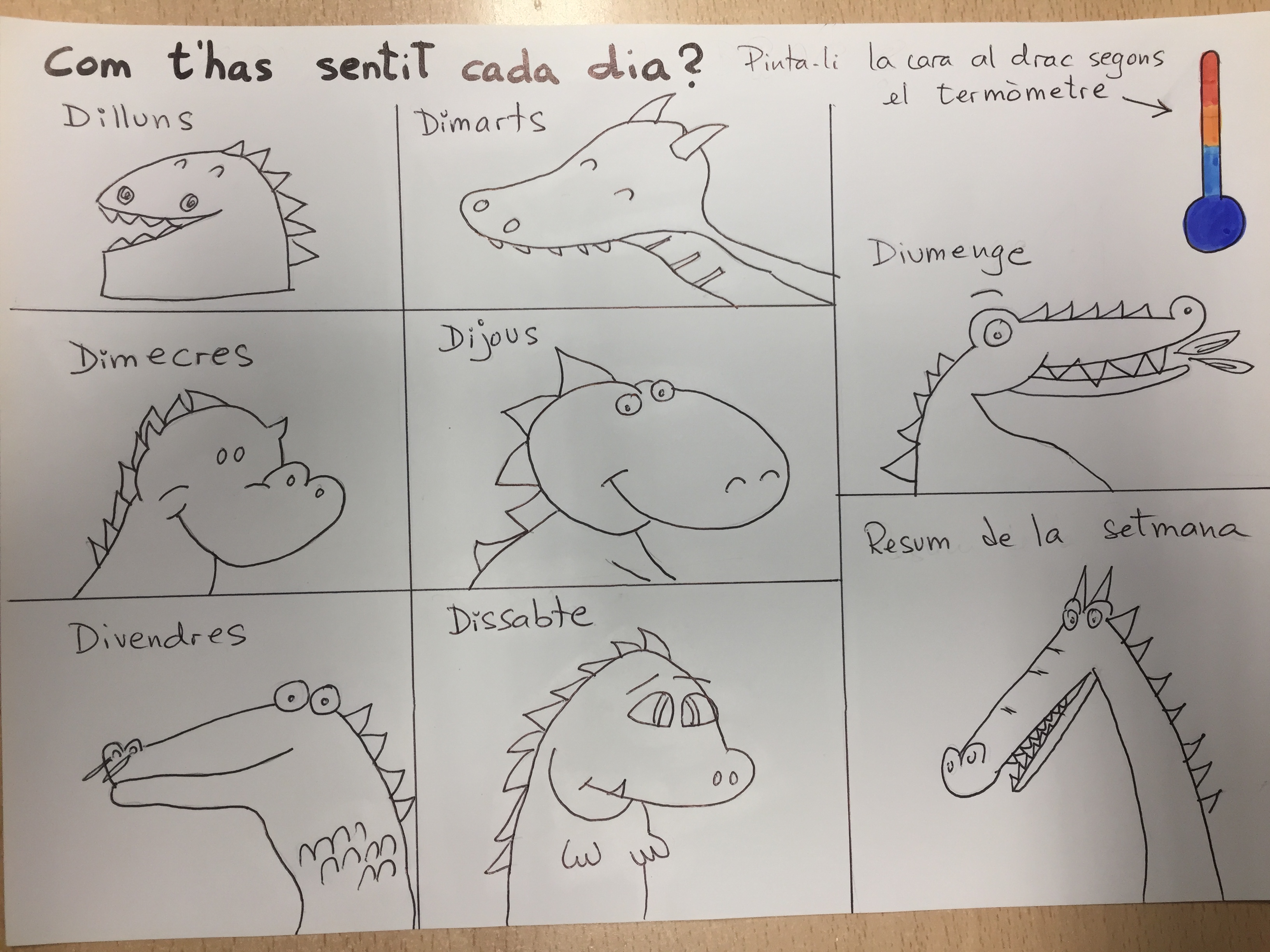 -Mireu el dibuix de baix. Com que avui és Sant Jordi  podríem començar pintant la cara del drac del dijous del color del termòmetre segons et sentis avui. I cada dia del color que et trobis. Pots imprimir la imatge del drac o bé dibuixar-los tú mateix/a en un full. Quan l’acabis me’l comparteixes al drive marmen65@xtec.cat així podré veure com t’has sentit. Doncs a pintar!!