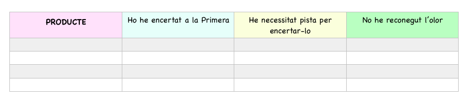 - All final anota els resultats en una taula com aquesta a la teva llibreta. Així veurem si tens un olfacte molt fi!