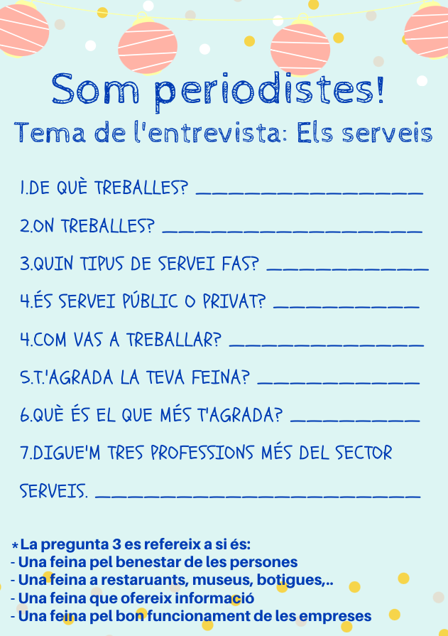 SOCIALS (Activitat 11) /21-Maig-2020/: SOM PERIODISTES! Feu un comentari / Per Rut Martínez / 21 de maig de 2020 / 3r de primària / Ciències socials, periodistes, serveis Mireu el vídeo per començar. PREGUNTES DE L’ENTREVISTA: (Si teniu algun dubte, podeu consultar el llibre de Socials, pàgs. 82-83).