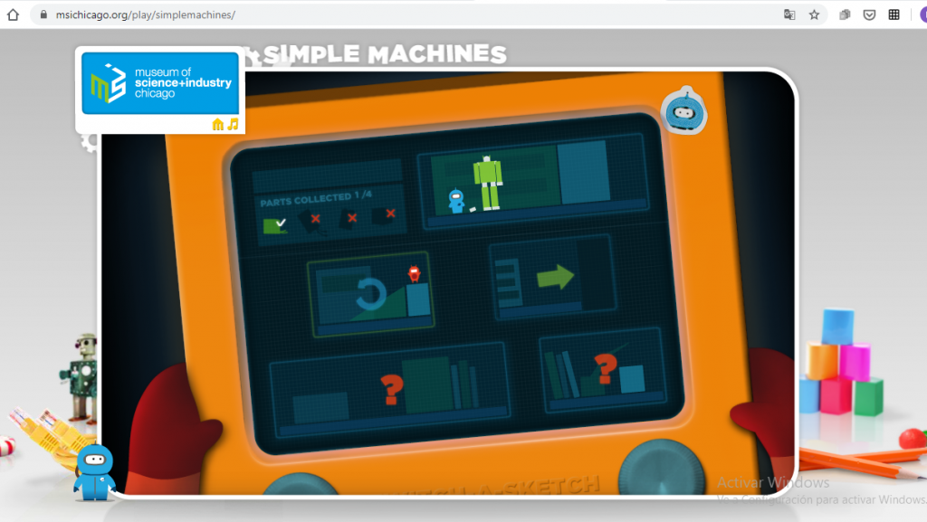 Avui seguirem amb les màquines i els mecanismes. I ho farem practicant amb un joc que simula i ens explica més coses d’aquestes màquines. Per fer això haurem d’anar aL Museu de la ciència de Chicago, on trobareu el joc SIMLES MACHINES. Es tracta de superar quatre pantalles utilitzant els coneixements ja adquirits sobre el tema. Més avall us poso la pantalla d’inici i l’enllaç al joc. Per fer el retorn de l’activitat podeu fer una foto de cada una de les pantalles assolides o una de la d’inici que mostri que us heu passat el joc i ho pengeu a la carpeta de Naturals.. Segur que ho aconseguiu!!!