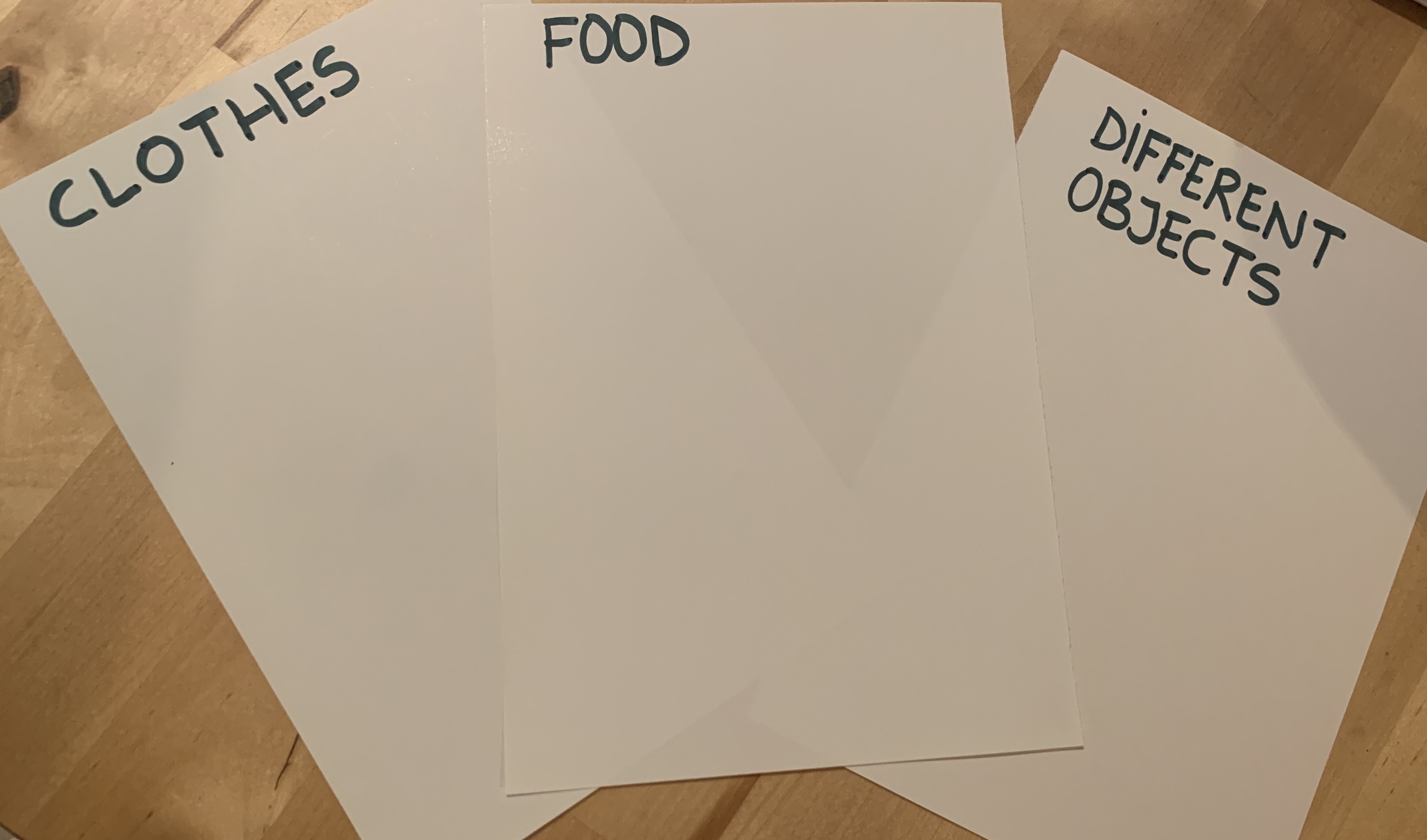 3. Write the titles of: FOOD, CLOTHES AND DIFFERENT OBJECTS on the papers.