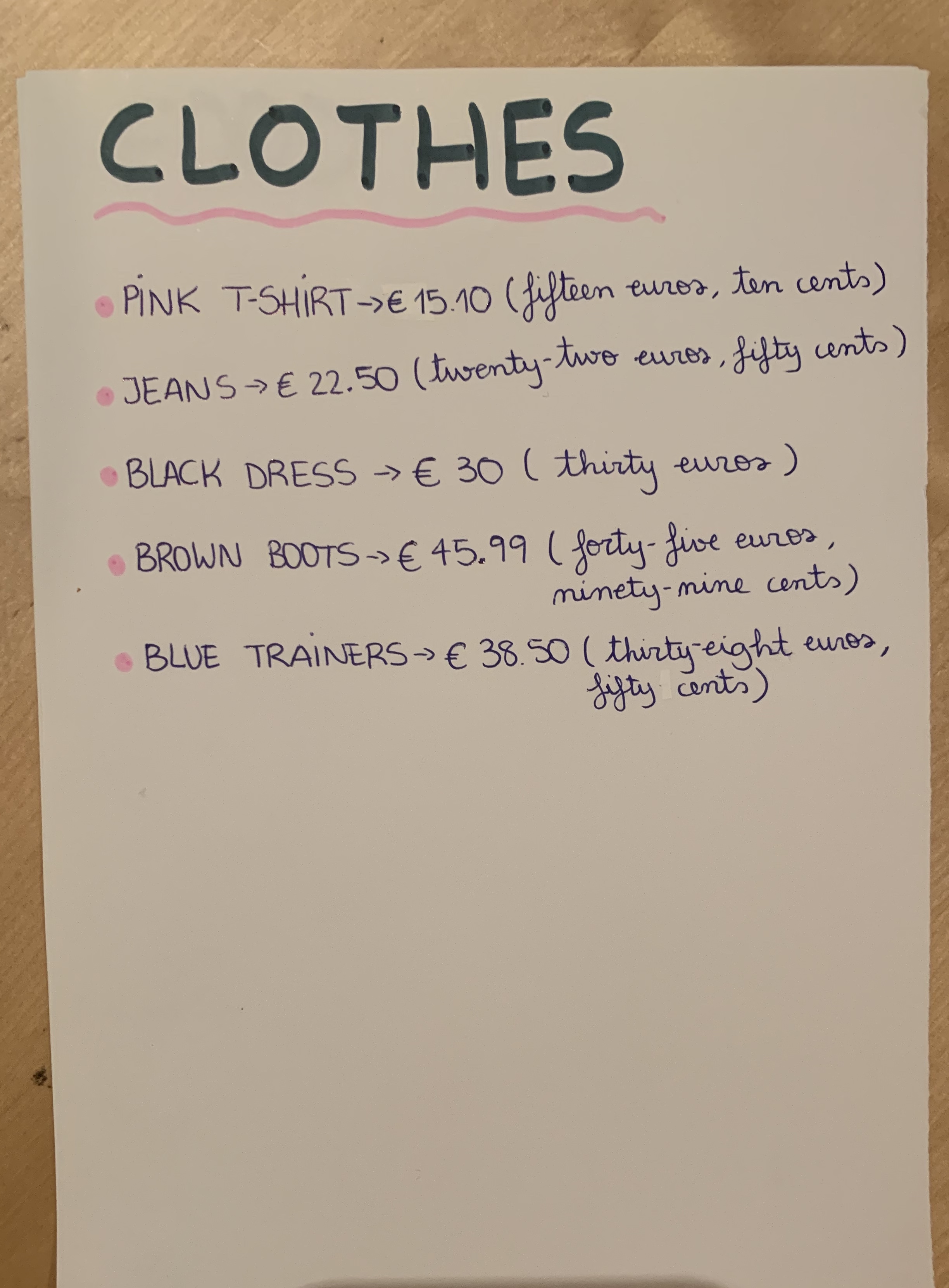 5. Go around your house again, and now choose eight items of clothing, write and give them a price.