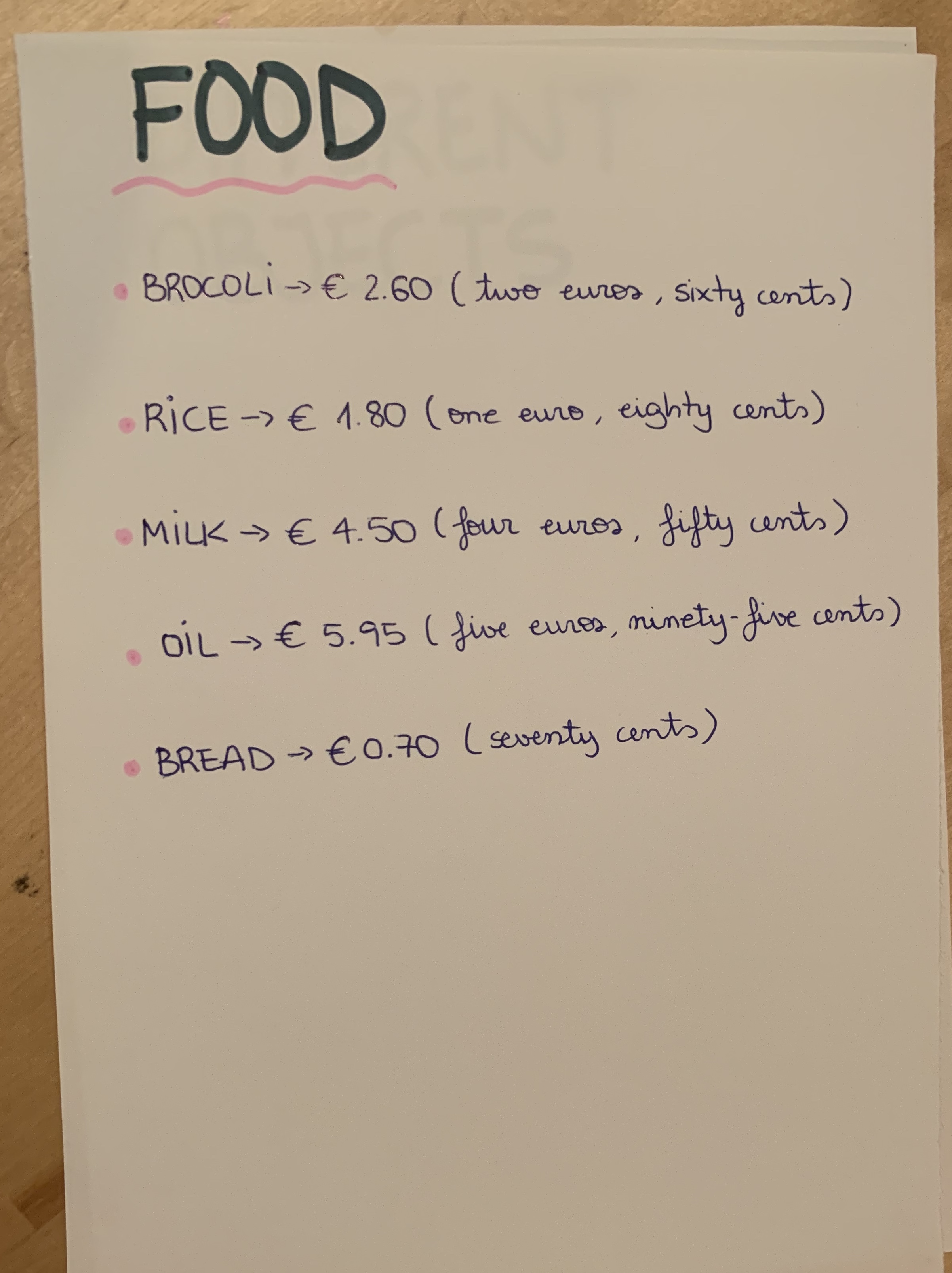 4. Go around your house, and choose eight different objects. Write them on the paper and give them a price.
